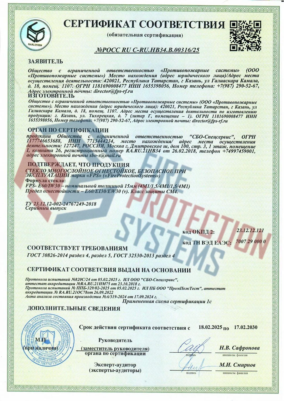 Огнестойкость: Класс EIW 30 — обеспечивает 30 минут защиты, сохраняя несущую способность (R), целостность (E), теплоизоляцию (I) и стойкость к тепловому излучению (W).